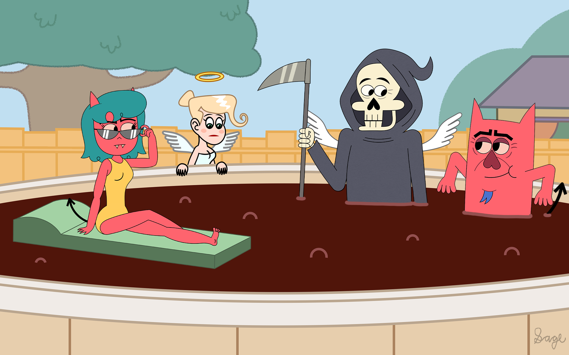 Pat (Devil Dad) invites his employer (Jim Reaper) over to have fun in a swimming pool…full of cola! (Just don’t put the mentos in.)